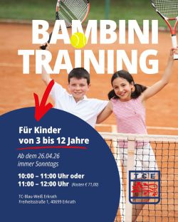 Unser allseits beliebtes Bambinitraining ist der ideale Einstieg für alle Kinder bis 12 Jahre und findet sonntags von 10:00 - 11:00 Uhr oder 11:00 - 12:00 Uhr auf den Plätzen 8 und 9 unserer schönen Anlage statt.