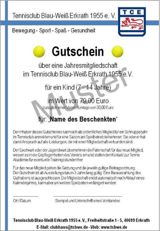 Erwerben Sie vom Tennisclub Blau-Weiß Erkrath 1955 e. V. einen Gutschein für ein Kind, einen Jugendlichen oder einen Erwachsenen, mit dem sich der Beschenkte für ein Schnupperjahr als Mitglied anmelden kann. Sie oder er hat damit Anspruch auf alle Leistungen, die mit einer Mitgliedschaft verbunden sind.